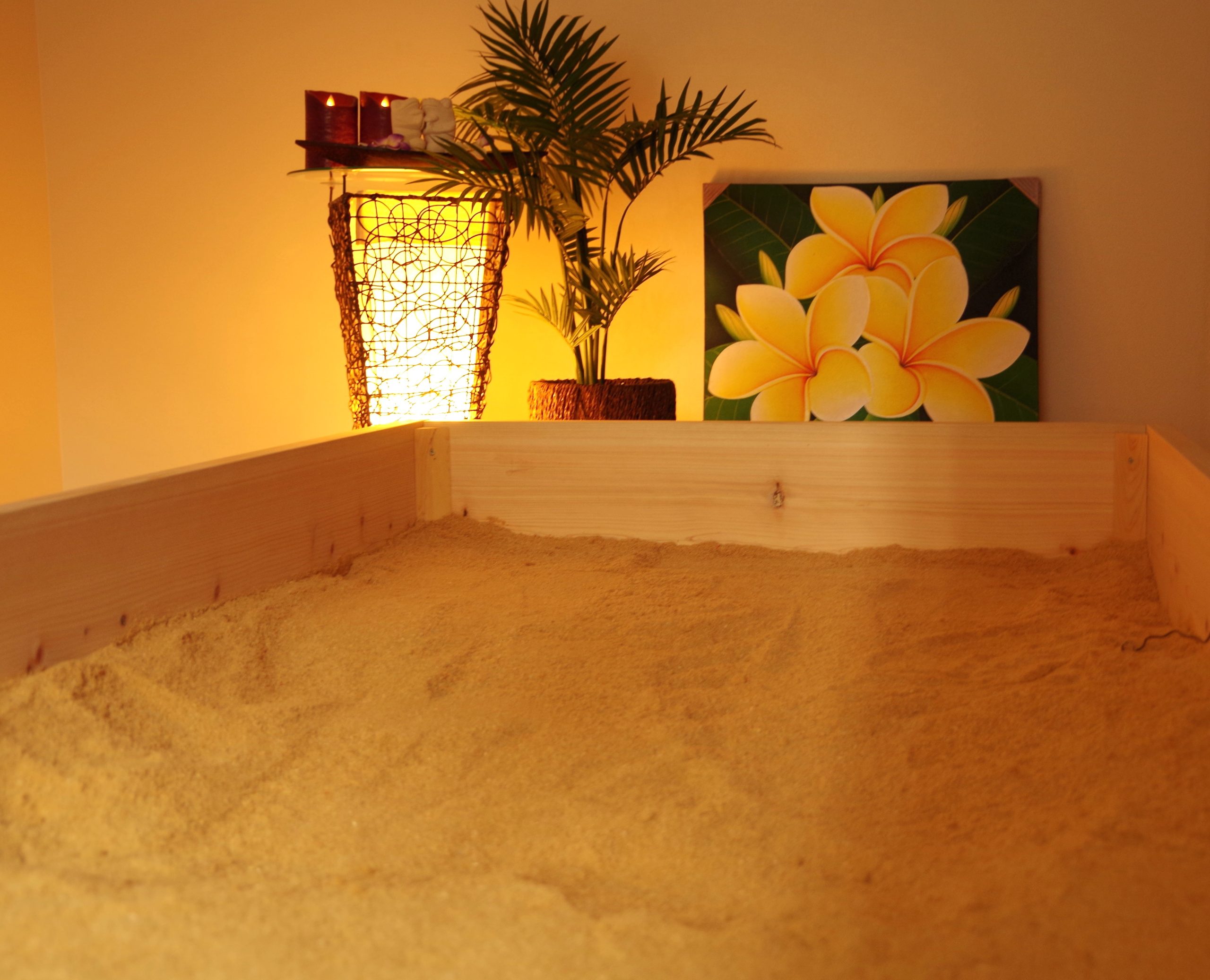 その中に砂風呂のように15分前後全身入って頂き、体を深部まで温める乾式温浴療法です。